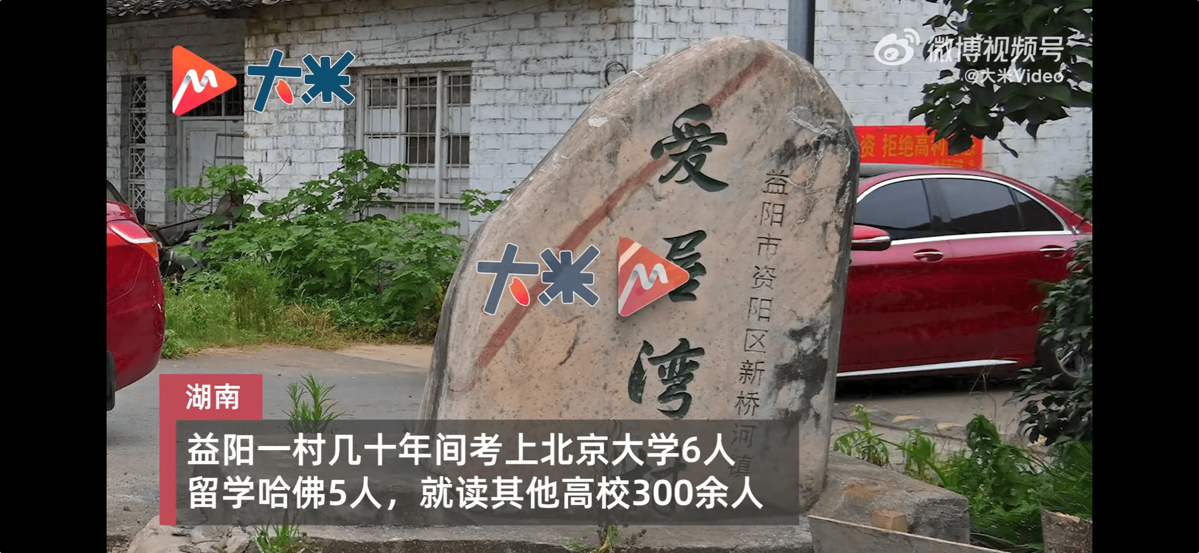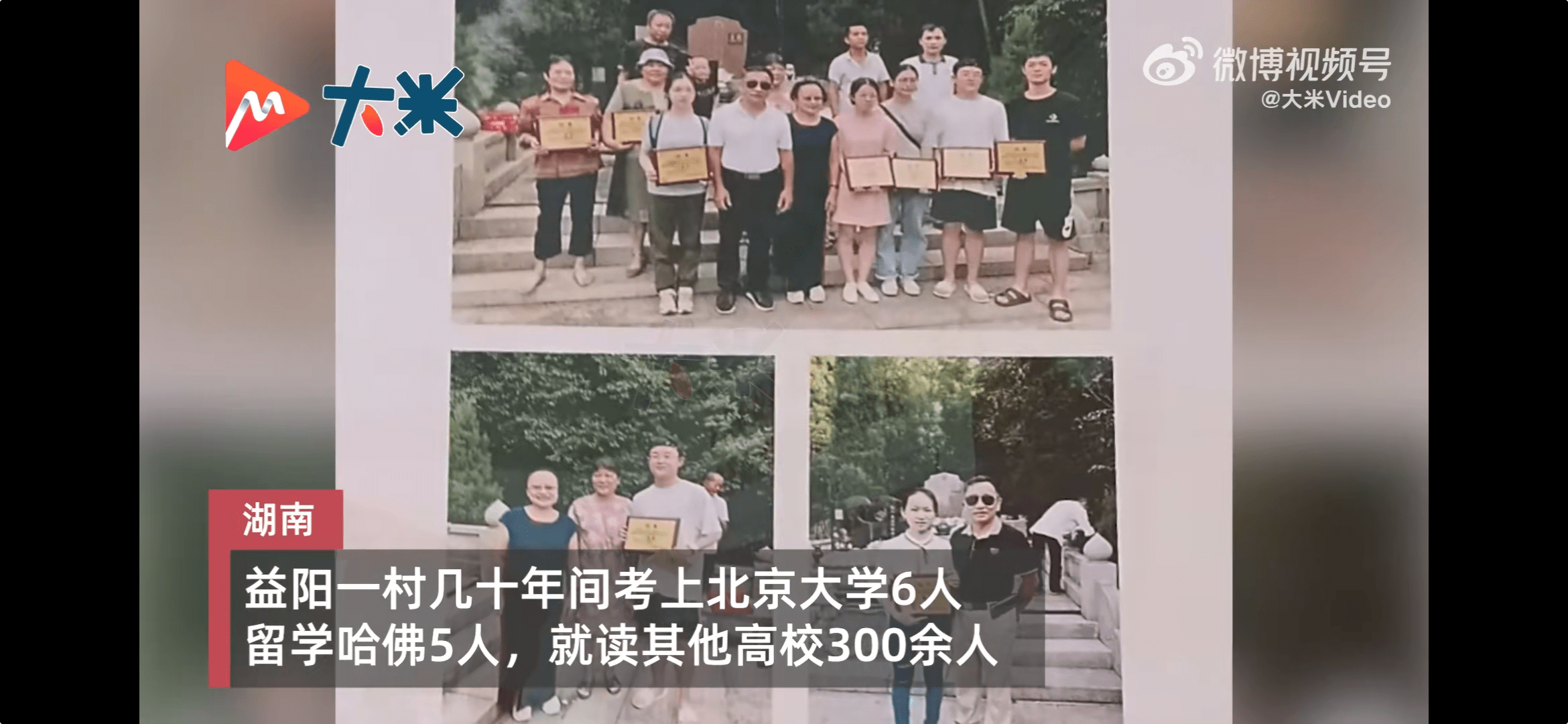 湖南益阳爱屋湾村,几十年间考上北京大学6人、留学哈佛5人、其他高校300余人。一位从村里走出的大学教授,捐款成立了助学基金,临终前还让儿女继续助学,考上一本奖4000二本3000,十年来累计奖励学生68名。
