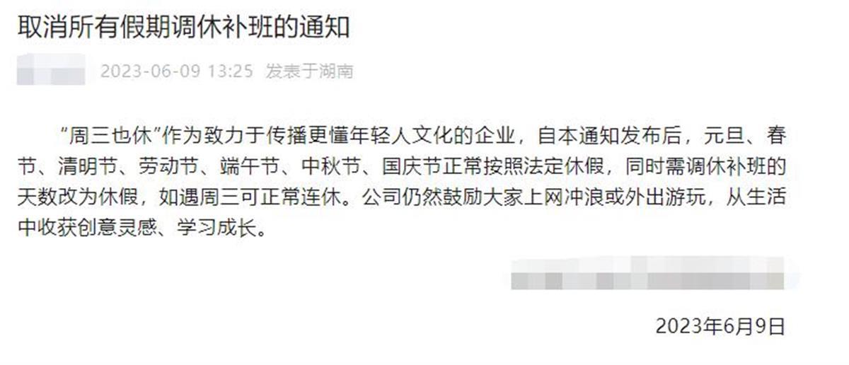 6月9日,湖南长沙一公司发布通知,称元旦、清明、端午、中秋等节日正常按照法定规定休假,同时需调休补班的天数也改为休假。此前,该公司还曾发通知称“全体员工每周三可带薪休假”。
