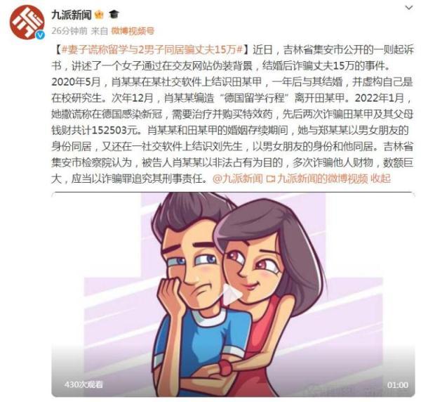 近日,吉林省集安市公开的一则起诉书,讲述了一个女子通过在交友网站伪装背景,结婚后诈骗丈夫15万的事件。2020年5月,肖某某在某社交软件上结识田某甲,一年后与其结婚,并虚构自己是在校研究生。次年12月,肖某某编造“德国留学行程”离开田某甲。2024年1月,她撒谎称在德国感染新冠,需要治疗并购买特效药,先后两次诈骗田某甲及其父母钱财共计152503元。肖某某和田某甲的婚姻存续期间,她与郑某某以男女朋友的身份同居,又还在一社交软件上结识刘先生,以男女朋友的身份和他同居。吉林省集安市检察院认为,被告人肖某某以非法占有为目的,多次诈骗他人财物,数额巨大,应当以诈骗罪追究其刑事责任。
