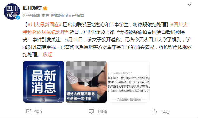 近日,广州地铁8号线“大叔被疑偷拍自证清白后仍被曝光”事件引发关注。6月11日,该女子公开道歉。记者今天从四川大学了解到,学校对此高度重视,已密切联系属地警方及当事学生了解核实情况,将按程序依规依纪处理。
