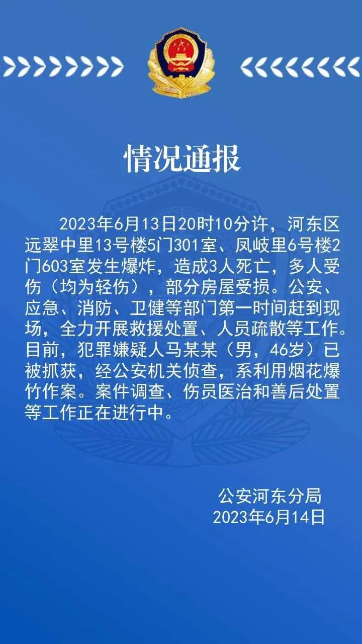 6月14日,天津河东公安分局发布情况通报:6月13日20时10分许,河东区远翠中里13号楼5门301室、凤岐里6号楼2门603室发生爆炸,造成3人死亡,多人受伤(均为轻伤),部分房屋受损。公安、应急、消防、卫健等部门第一时间赶到现场,全力开展救援处置、人员疏散等工作。