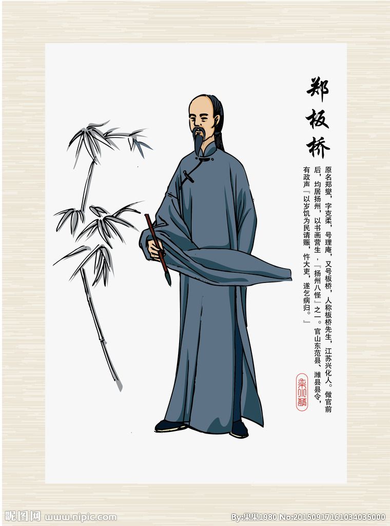 郑板桥(1693年-1766年),原名郑燮,字克柔,号理庵,又号板桥,人称板桥先生,江苏兴化人,祖籍苏州。清代书画家、文学家。康熙秀才,雍正十年举人,乾隆元年(1736年)进士。官山东范县、潍县县令,政绩显著,后客居扬州,以卖画为生,为“扬州八怪”重要代表人物。