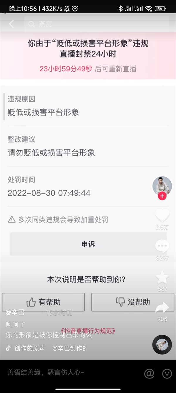 而辛巴今日发布的视频中,直接把抖音官方给出的封禁理由贴了出来,并嘲讽抖音“你的形象是被你控制出来的么?”