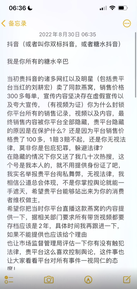 辛巴在长文中透露,当初抖音的诸多网红以及明星(包括刘耕宏)卖了同款燕窝,销售价格300多每单,宣传内容坚决存在虚假宣传以及夸大宣传 (有视频为证)。