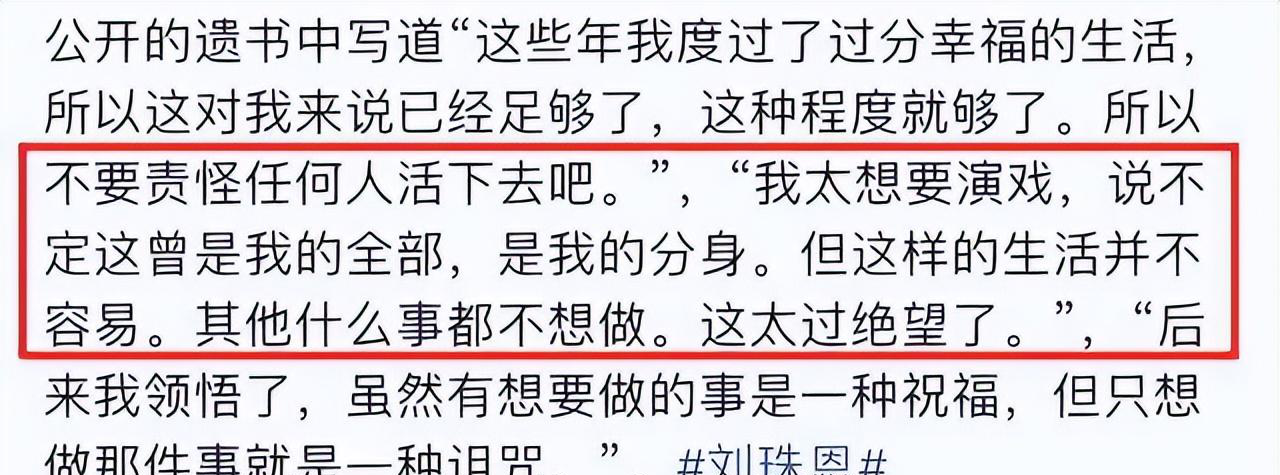 刘珠恩的哥哥同时公布了刘珠恩的遗嘱,刘珠恩在遗嘱中感谢父母、兄弟、恩师、粉丝们,感谢来自所有人的爱。 也表达了对戏剧的爱,戏剧就是她的一切。 我想演戏,但是生活很难。