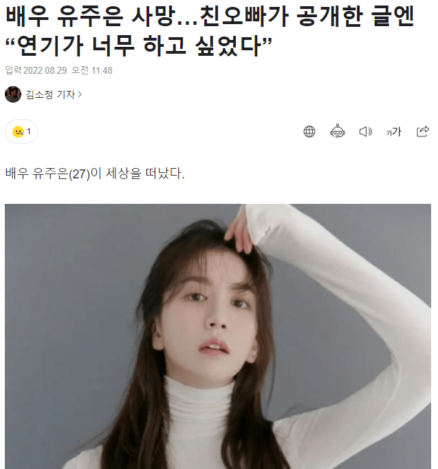 韩国另一位年轻女演员刘珠恩自杀身亡,年龄永远固定在27岁。 刘珠恩的哥哥在个人社交媒体上沉痛地告诉了粉丝们这个消息。 如果喜欢她的人有时间的话,请在她离开的途中跟她打声招呼。