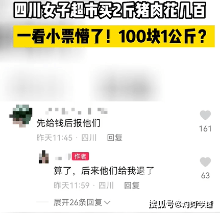 这个女子在超市购买2斤猪肉,花了103块,最后经过与商家理论才退了款。买肉时可能忘了看价格,而超市或许迫于压力没办法。超市的猪肉有很多品牌,比如黑猪肉本就贵,也有普通饲养的猪肉就便宜。这两种不在一个区域,一般贵的都是专门的品牌专用区。