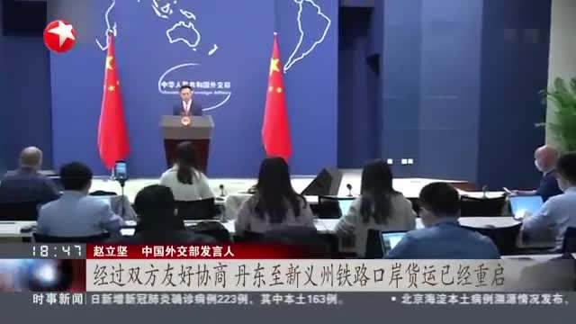 汪文斌称,日前中朝双方根据两国相关的涉边条约,并通过友好协商决定重启丹东—新义州口岸铁路货运。双方将继续加强协调配合,积极保障铁路货运安全稳定运行,为中朝友好关系发展作出贡献。