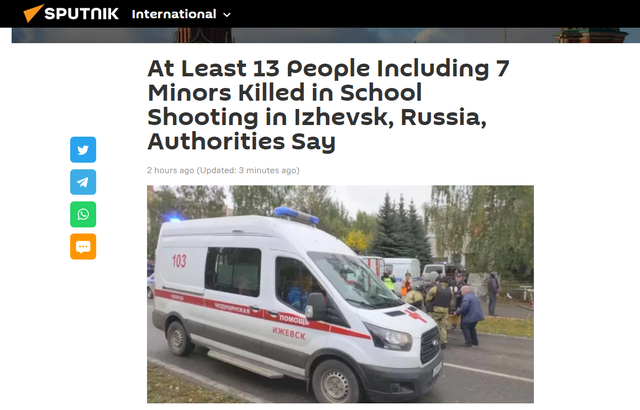 据俄罗斯卫星通讯社刚刚消息,俄罗斯乌德穆尔特共和国首府伊热夫斯克的校园枪击案已造成至少13人死亡,包括7名未成年人。