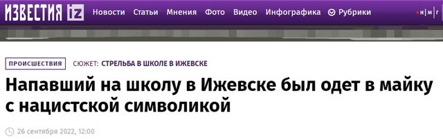 “今日俄罗斯”(RT)、俄卫星社、《消息报》等俄媒均援引俄罗斯联邦侦查委员会消息称,伊热夫斯克校园枪击事件的袭击者事发时穿着一件带有纳粹标志的黑色背心,戴着头套,且未随身携带证件。目前正确定该枪手身份。