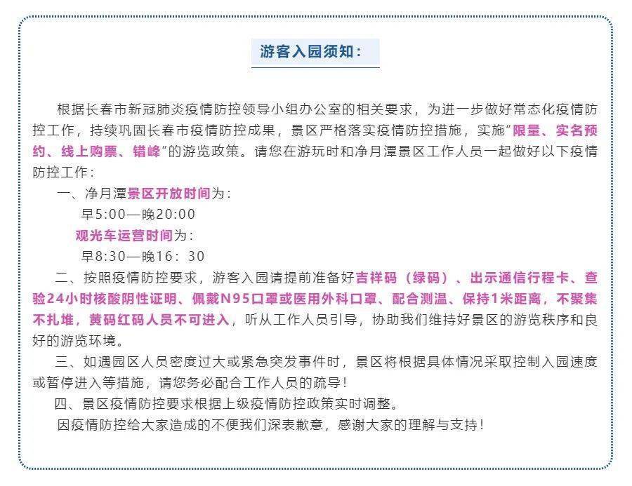 根据吉林省疫情防控相关要求, 净月潭景区游客入园需出示吉祥码绿码、通行行程卡、核酸阴性证明,行程卡显示来自 省内的游客需持 72小时内核酸检测阴性证明,显示有 省外旅居史游客需持有 48小时内核酸检测阴性证明。