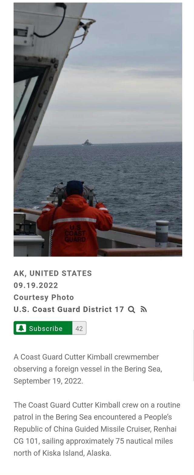 9月26号,美国国防部下属图片和信息公开网站DVID发布消息证实,9月19号,由055型导弹驱逐舰“南昌”舰等组成的中俄海军联合巡逻编队出现在白令海,阿拉斯加基斯卡岛以北约75海里处,美国海岸警卫队派出“金博尔”号巡逻舰跟踪监视。根据美方的通报,中俄舰队包括三艘中国军舰和四艘俄罗斯军舰。