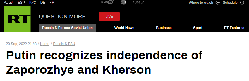 据“今日俄罗斯”(RT)、俄罗斯卫星通讯社消息,俄罗斯总统普京当地时间周五(9月30日)签署法令,承认赫尔松和扎波罗热为“独立”于乌克兰的地区,这些法令立即生效。