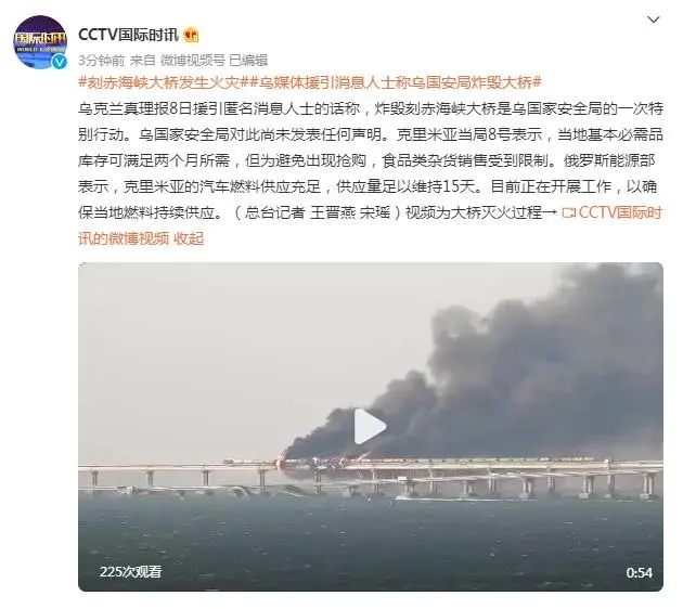 另据俄罗斯卫星通讯社报道,克里米亚大桥发生的卡车爆炸导致7辆油罐车起火。公路桥两个地方出现部分倒塌。大桥地面上的拱门未受损。地方当局的初步信息显示,无人在紧急情况中受伤。