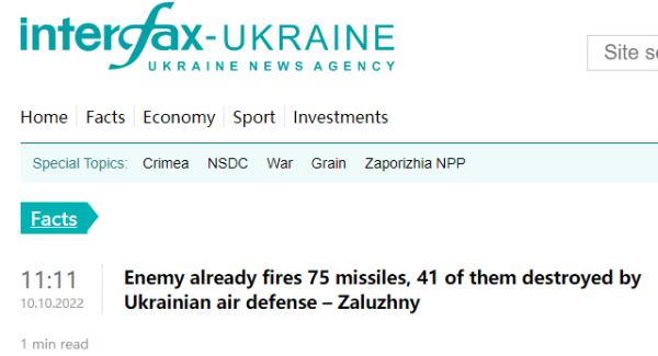 据乌克兰国际文传电讯社10日最新报道,乌克兰武装部队总司令扎卢日内在社交平台Telegram上称,俄军已经向乌克兰发射了75枚导弹,其中41枚被乌克兰防空系统拦截摧毁,乌克兰武装部队正在尽一切所能保护公民。