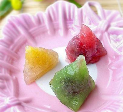 7、将蒸好的水晶粽拆开,里面呈现透明的,能隐隐约约看到里面的馅儿,Q弹有嚼劲,非常好吃。