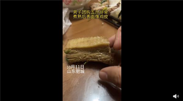 10 月 11 日,山东肥城一男子团购五斤排骨,煮熟后发现表面像鸡皮,还有腥味,吃了两块就没敢再吃。