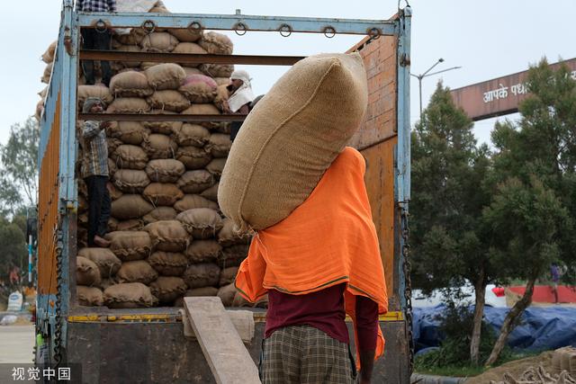 10月9日,印度安巴拉,粮食市场里,工人们将一袋袋大米装上卡车。(视觉中国)