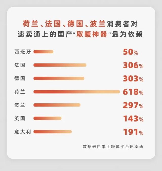 其中来自荷兰、法国、德国和波兰消费者对中国产的取暖器、暖脚宝、电热围巾等“保暖神器”最为依赖。
