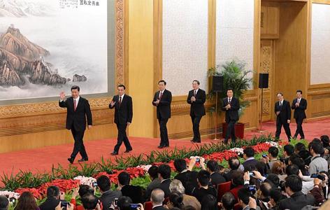 在热烈的掌声中,新当选的中共中央总书记习近平和中央政治局常委李克强、栗战书、汪洋、王沪宁、赵乐际、韩正,迈着坚定的步伐,步入人民大会堂东大厅。习总书记身穿深色西服,面带微笑,神采奕奕,向在场的中外记者招手致意。顿时,雷鸣般的掌声和“咔嚓、咔嚓……”的相机快门声响成一片。不仅全场的注意力在此刻聚焦,13亿多中国人民的热切目光也投向这里、全世界的深切关注被吸引到这里。