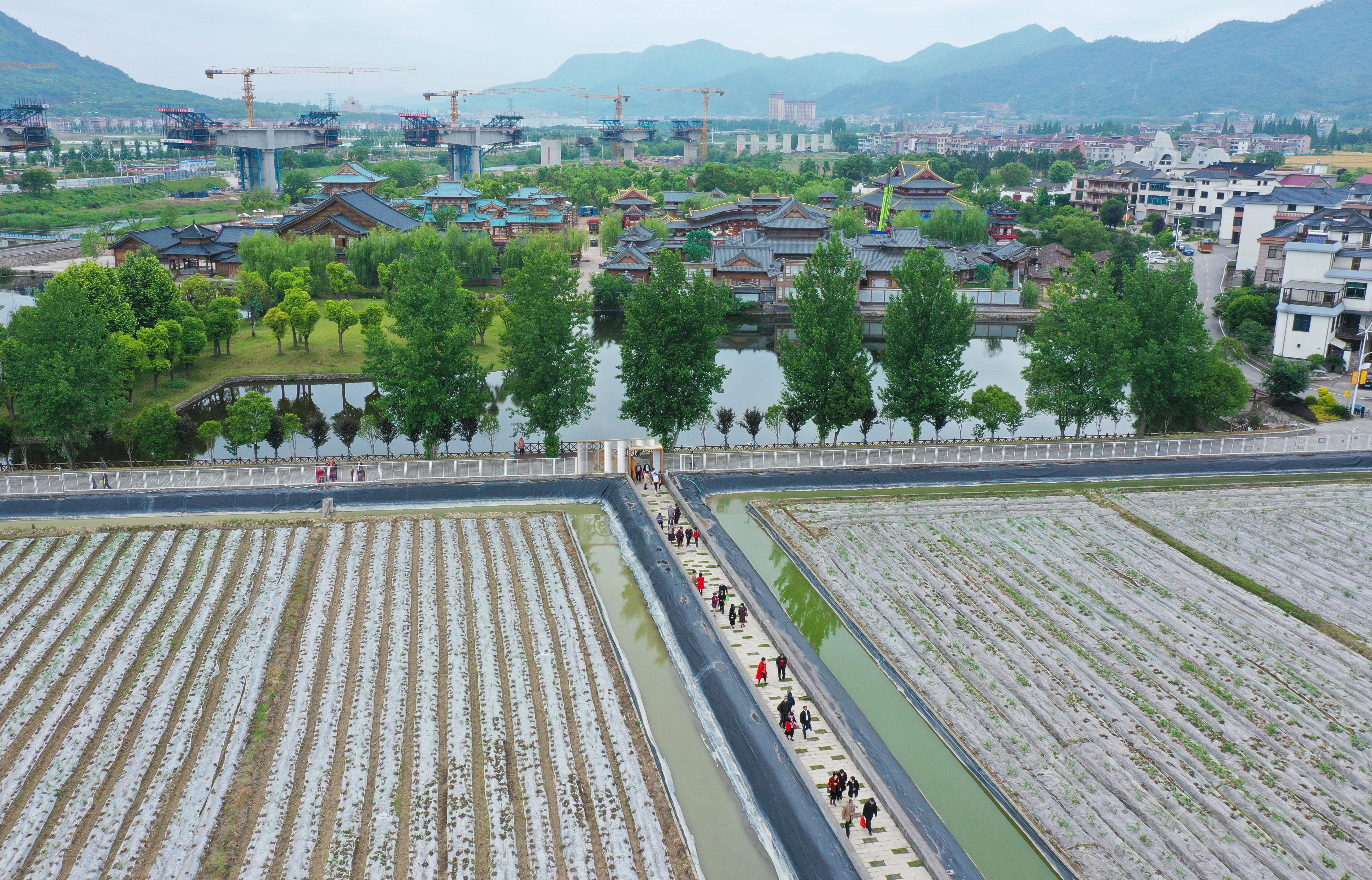 2024年5月10日,浙江东阳,从空中俯瞰湖溪镇八里湾村,绿油油的水稻等农作物与阡陌田园、秀美村庄相互映衬,呈现出一幅美丽的乡村振兴画卷。图/IC photo