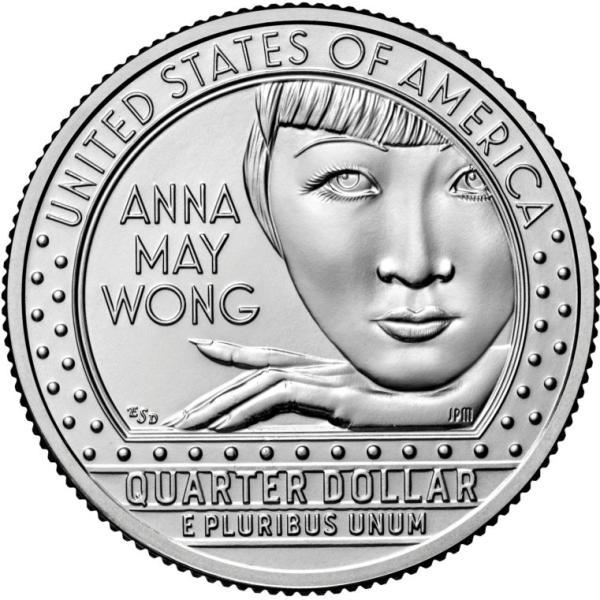 全新的25美分硬币,正面人物肖像为黄柳霜黄柳霜于1905年生于洛杉矶,14岁时初登银幕,随后渐渐在默片时代的好莱坞闯出一片天。1922年,17岁的黄柳霜在影片《海逝》(The Toll of the Sea)中首度出任女主角。此后,她与玛琳·黛德丽、琼·克劳馥、劳伦斯·奥利弗、道格拉斯·范朋克、查尔斯·劳顿等那个时代好莱坞的著名演员合作拍摄了《月宫宝盒》《唐人街繁华梦》《上海快车》等佳作。她的齐刘海和细长眉毛,也引领了一种全新的饱含东方韵味的时尚风潮。