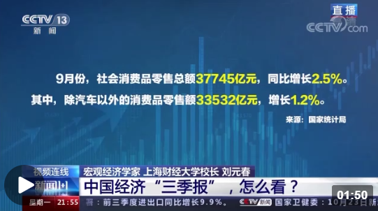 宏观经济学家、上海财经大学校长 刘元春:9月社会消费品零售总额同比增长2.5%,这里面汽车消费占了大头。同时,一些新业态的消费也明显呈现出上扬的态势。这些变化与整个政策、技术提升都有关系,特别是目前全球产业链、供应链出现一系列问题的状况下,我们发挥了制造业大国的优势,发挥了我们在前期新能源转型上的一些优势,起到了“异军突起”的作用。