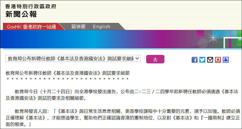 教育局今日(十月二十四日)向全港学校发出通告,公布由2023/24学年起新聘任教师必须通过《基本法》及《香港国安法》测试的要求及相关细节。