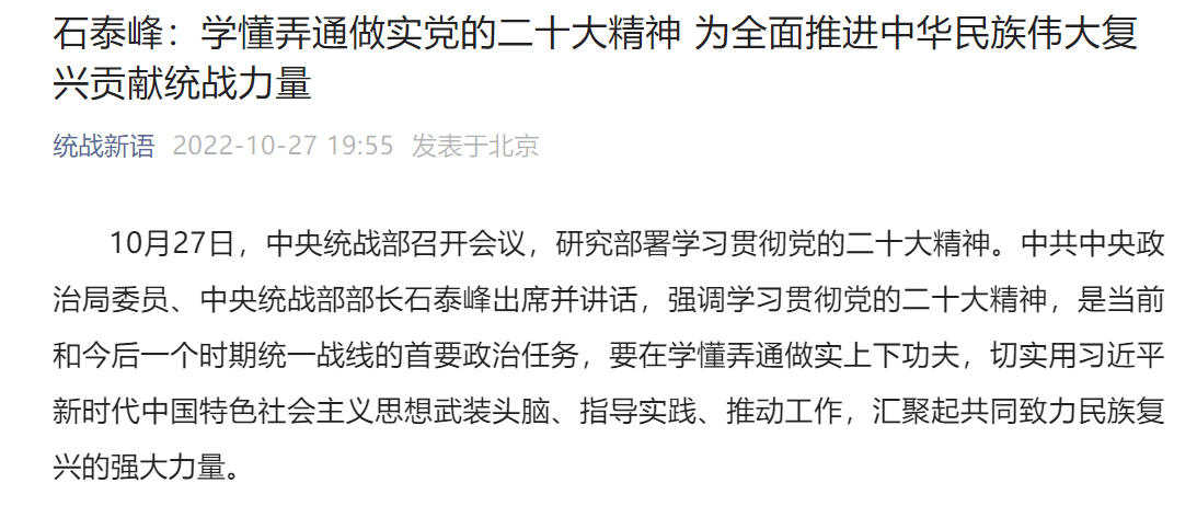 据中央统战部宣传办公室官方微信公众号“统战新语”消息,10月27日,中央统战部召开会议,研究部署学习贯彻党的二十大精神。中共中央政治局委员、中央统战部部长石泰峰出席并讲话,强调学习贯彻党的二十大精神,是当前和今后一个时期统一战线的首要政治任务,要在学懂弄通做实上下功夫,切实用习近平新时代中国特色社会主义思想武装头脑、指导实践、推动工作,汇聚起共同致力民族复兴的强大力量。
