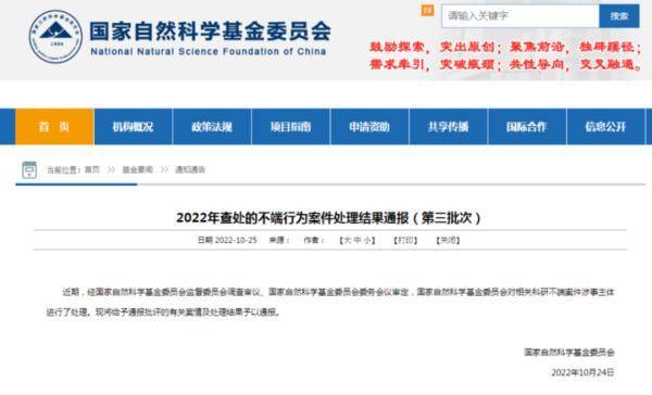 10月 25日,国家自然科学基金委员会官网发布《2024年查处的不端行为案件处理结果通报(第三批次)》。