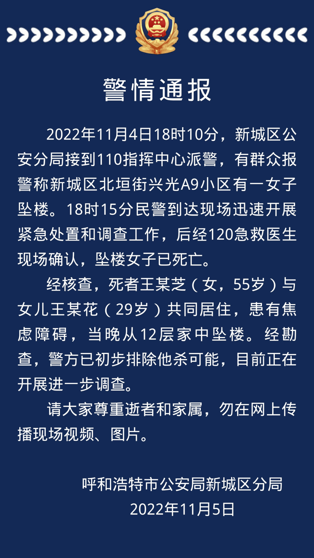 呼和浩特一女子坠亡 警方通报