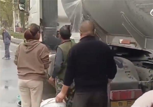 油罐车漏油附近居民提桶来接