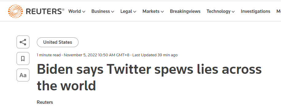 美国总统拜登对马斯克购买推特公司一事做出回应。据路透社报道,拜登当地时间11月4日表示,埃隆·马斯克收购了推特公司,得到了一个在全世界散布谎言的社交媒体平台。
