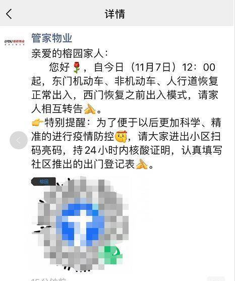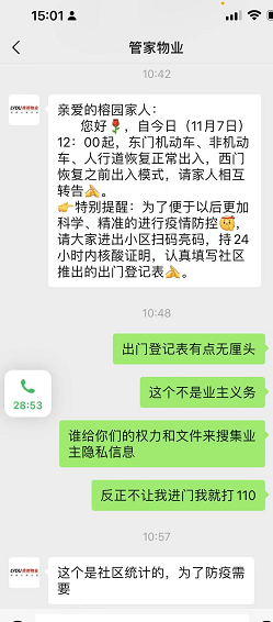 从小区居民出示的聊天记录显示,物业方面回复居民质疑时称,“这是社区统计的,为了防疫需要”。