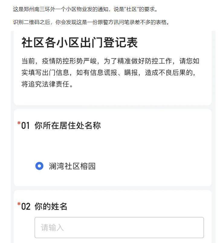 11月7日,郑州市管城区十八里河街道办事处澜湾社区小区居民反映,在出门时被物业工作人员要求填写一个“出门登记表”,出门登记表称为防疫需要要求居民填写,但居民发现其中包括了“政治面貌”“职业”等疫情无关的信息,“不填不让出门”,有居民在社交媒体反映此事后,引发争议。