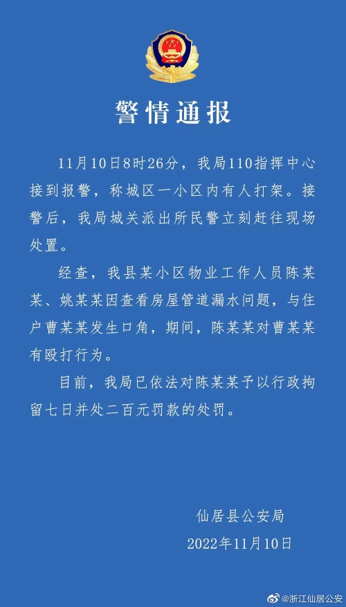 浙江省台州市仙居县公安局官方微博通报,11月10日8时26分,该局110指挥中心接到报警,称城区一小区内有人打架。接警后,该局城关派出所民警立刻赶往现场处置。