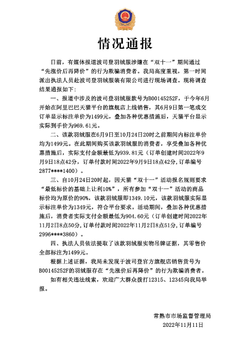 常熟市市场监督管理局发布的情况通报显示,报道中涉及的波司登羽绒服款号为B00145252F,于今年6月开始在阿里巴巴天猫平台的旗舰店上线销售。该款羽绒服在6月9日至10月24日20时之前标注单价均为1499元。在此期间购买该款羽绒服的消费者,享受叠加各种优惠措施后,实际支付金额最低为939.81元。自10月24日20时起,因天猫“双十一”活动报名规则要求“最低标价的基础上让利10%”,所有参加“双十一”活动的商品标价均为原价的90%,该款羽绒服即1349.1元,该款羽绒服实际显示标注单价为1349元,符合平台要求。活动期间,叠加各种优惠措施后,消费者实际支付金额最低为904.6元。执法人员依法提取了该款羽绒服实物吊牌证据,其零售价全部标注为1499元。根据上述证据,常熟市市场监督管理局未发现于波司登官方旗舰店销售货号为B00145252F的羽绒服存在“先涨价后再降价”的行为欺骗消费者。