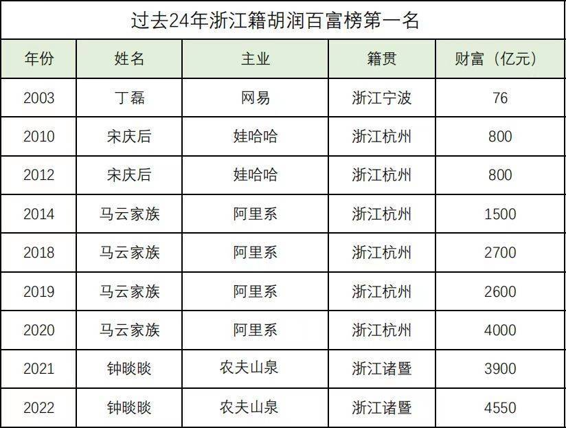 此外,时代周报记者梳理发现,胡润百富榜自1999年创建以来,共计发布榜单24次,浙商共计9次问鼎首富位置。丁磊是首个问鼎中国首富的浙商,马云4次登顶,娃哈哈创始人的宗庆后、钟睒睒也都2次登顶。