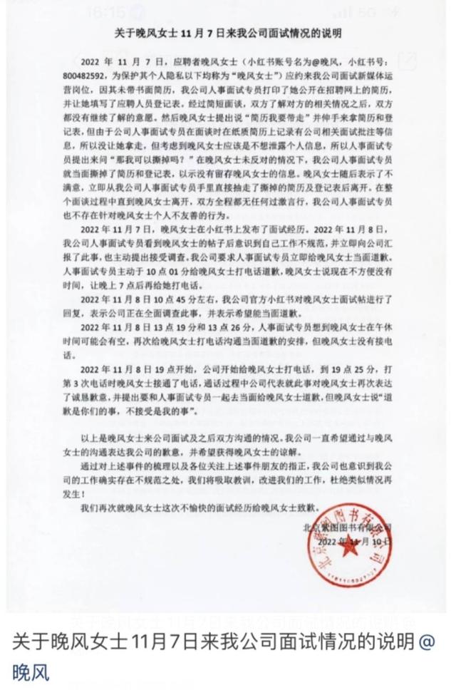 11月10日,涉事北京紫图图书有限公司发布《关于小风女士11月7日来我公司面试情况的说明》称,应聘者小风应约来面试新媒体运营岗位,因其未携带书面简历,人事面试专员打印了她公开在招聘网上的简历,并让她填写了应聘人员登记表。