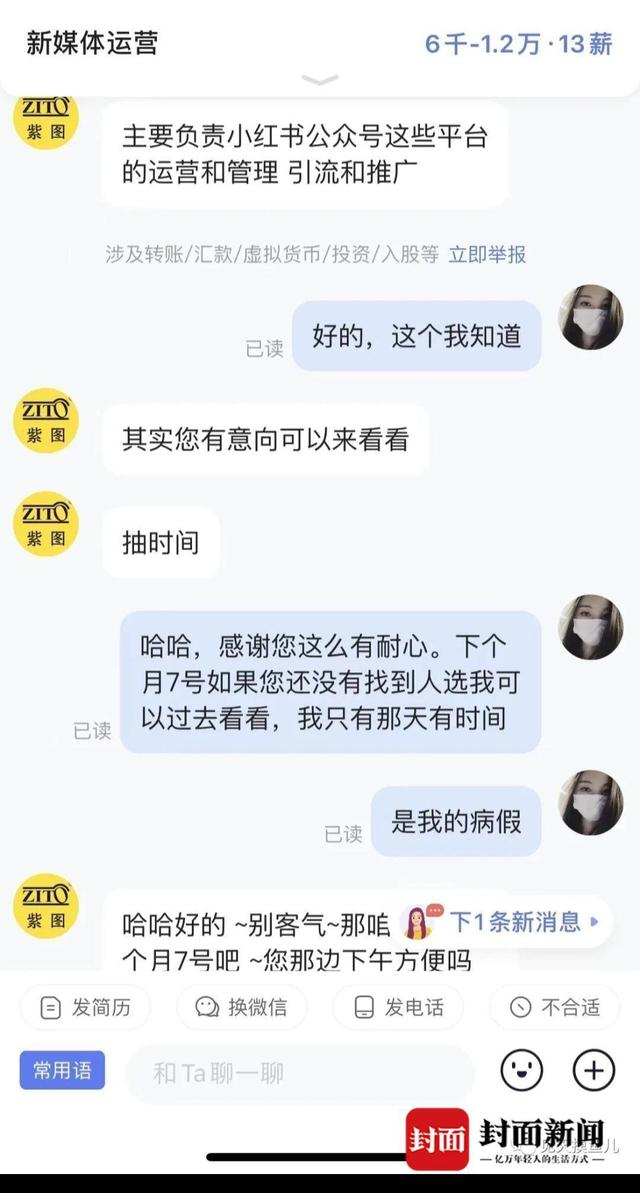 10月25日,“紫图图书”的工作人员就一份新媒体运营岗位联系小风。小风回复称,暂时不会跳槽,工作人员继续邀约,并称负责人想线下详聊,可以抽空来看看。小风称,如果下月7日对方还没招到人,就去公司看看。