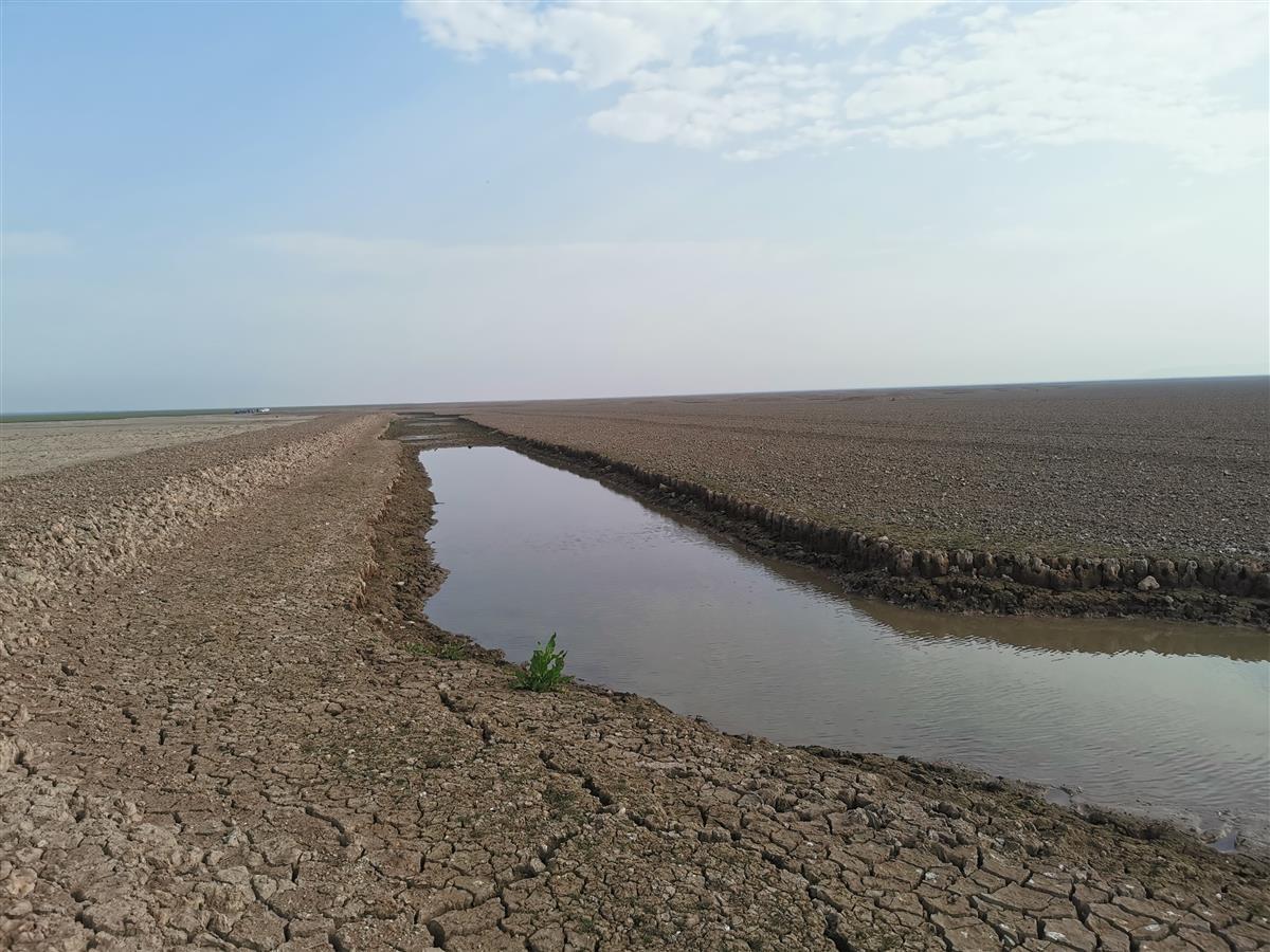 从航拍的镜头来看,在湖床上的黄沙中间,有一块被“河道”围起来的浅红色的长方形区域。区域内,有多个大型正方形“方块”,每个“方块”看上去像个小迷宫。大方块周边,散落着不少小方块,星罗棋布。