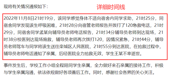 11月13日,校方发布了针对此次事情的情况通报,在通报中提到了几个细节:当天(8日)21点19分,该学生感觉身体不适向舍友求助,21点25分,该学生出现呼吸困难,3分钟后,同学向宿管报告并拨打120,21点38分,校医到场,辅导员再次拨打120,21点44分,辅导员驾车将该学生送往栾城区人民医院,该学生经抢救无效离世。