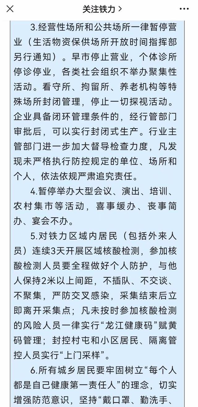 11月13日凌晨,黑龙江铁力市宣布在全市范围内实行“3天临时性管控措施”。