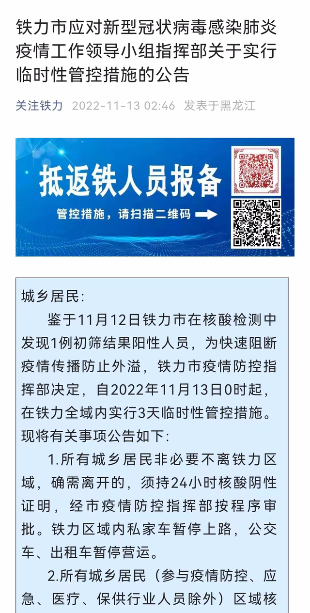 根据铁力市发布的公告,11月12日,铁力市在核酸检测中,发现了1例初筛结果阳性人员,“为快速阻断疫情传播防止外溢”,从11月13日0时起,全域管控。