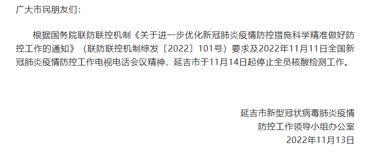 11月13日,延吉市防疫部门发布公告,宣布于11月14日起停止全员核酸检测工作。此前,延吉市于11月7日发布公告,决定在8日~14日期间,按照指定街镇开展七天一轮全员核酸检测。