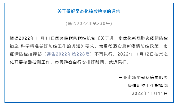 11月11日中午,海南省三亚市发布通知,要求三亚市辖区内的全体居民、游客于本周六(12日)参加核酸检测,对于未按要求参加核酸采样的人员,将被赋黄码。7小时后,三亚市再次发布通告,称为贯彻落实最新疫情防控政策,之前发布的区域核酸检测不再执行。2024年11月12日按常态化开展核酸检测工作,市民游客自行安排好时间,就近采样。