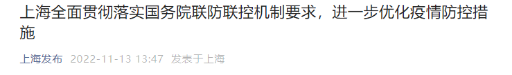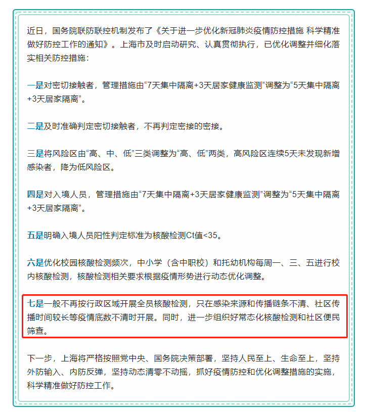 同日,上海市也发布了优化调整并细化落实相关防控措施的内容,宣布一般不再按行政区域开展全员核酸检测,只在感染来源和传播链条不清、社区传播时间较长等疫情底数不清时开展。同时,进一步组织好常态化核酸检测和社区便民筛查。