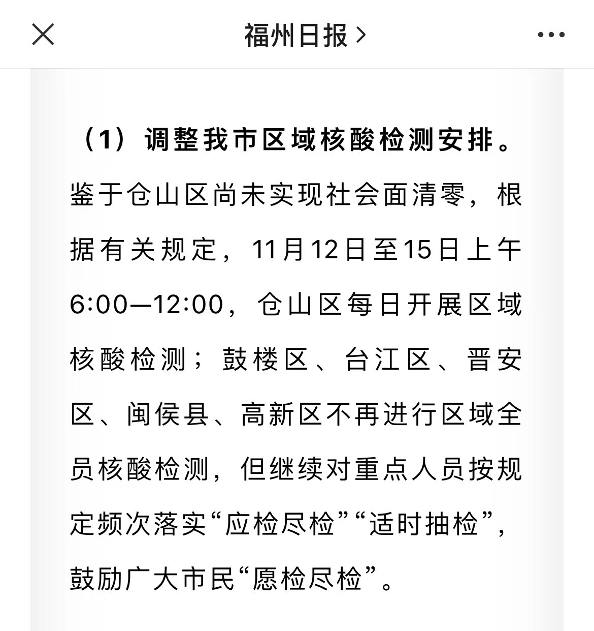 12日,福建省福州市召开新闻发布会,通报疫情防控最新情况。其中提出,鉴于仓山区尚未实现社会面清零,根据有关规定,11月12日至15日上午6:00—12:00,仓山区每日开展区域核酸检测;鼓楼区、台江区、晋安区、闽侯县、高新区不再进行区域全员核酸检测。