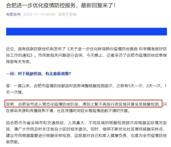 根据“合肥发布”11月14日凌晨消息,安徽省合肥市疫情防控应急指挥部有关专家表示,合肥全市进入常态化疫情防控阶段,原则上暂不再按行政区域开展全员核酸检测,只在感染来源和传播链条不清、社区传播时间较长等疫情底数不清时开展。
