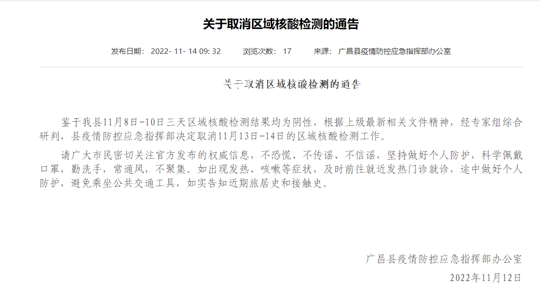 12日,江西省广昌县疫情防控应急指挥部办公室也发布消息称,鉴于11月8日~10日三天区域核酸检测结果均为阴性,根据上级最新相关文件精神,经专家组综合研判,决定取消11月13日-14日的区域核酸检测工作。